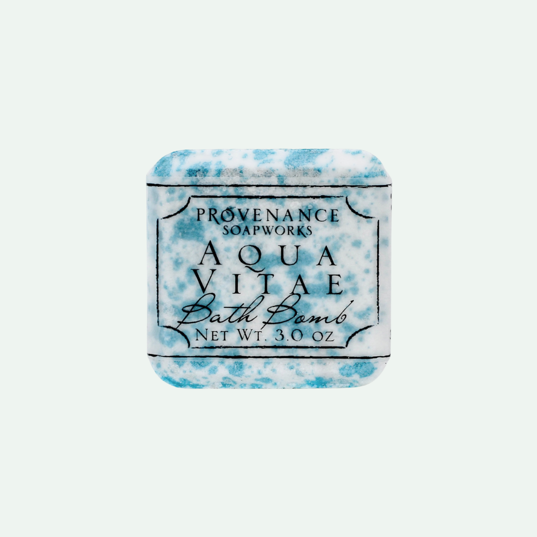 • A square Aqua Vitae bath bomb with a blue and white marbled design, labeled with the product name and brand, Provenance Soapworks.
