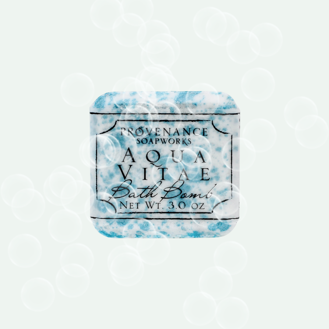 • A square Aqua Vitae bath bomb with a blue and white marbled design, labeled with the product name and brand, Provenance Soapworks with a bubble overlay.