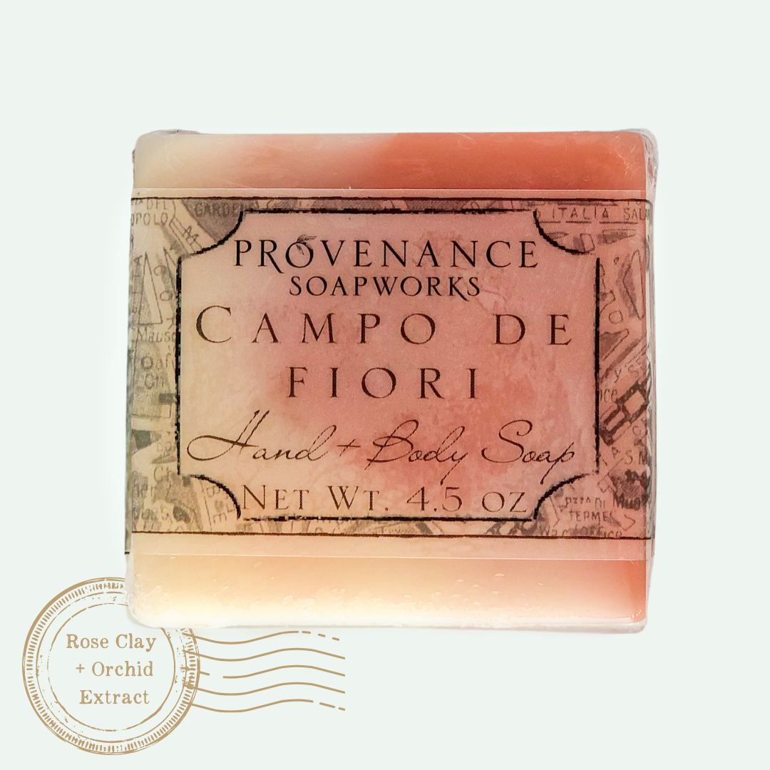 Literally translated, Campo de' Fiori means "Field of Flowers" in Italian. A beautiful blend of peony, honey & creamy white musk intertwine to create a timeless fragrance.  Orchid extract, infused into the soap to moisturize & help fight free radicals, plus rose kaolin clay to gently cleanse skin of impurities, create a beautifully balanced pairing.