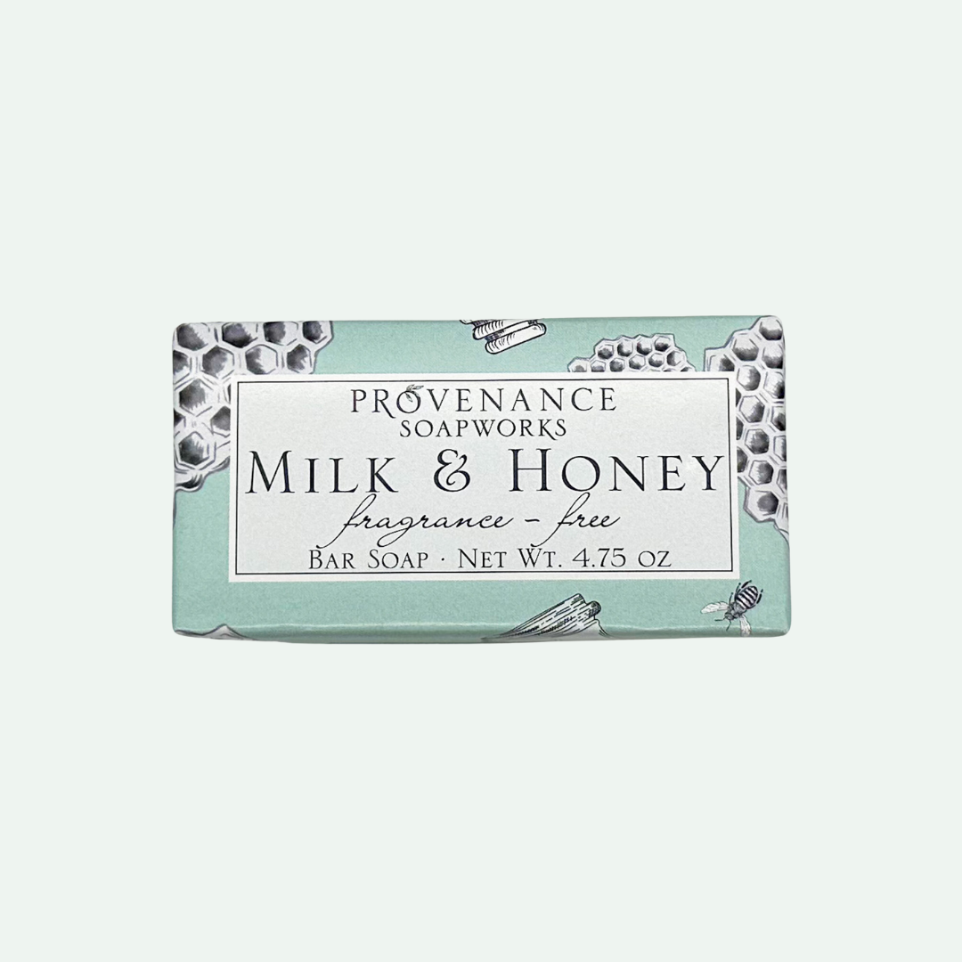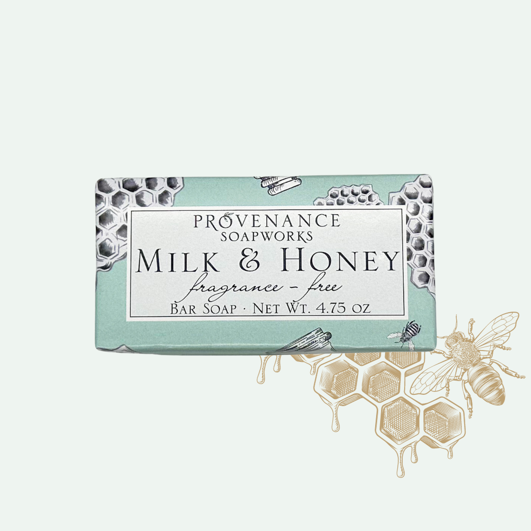 • A bar of unscented Milk & Honey soap with a label indicating the brand and scent, placed on a pale background.  Sketches of honeycomb and a bee in right hand corner