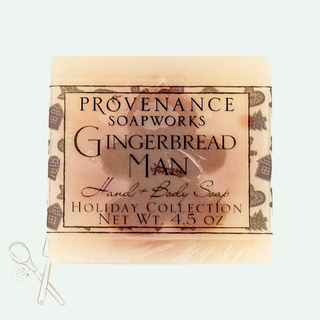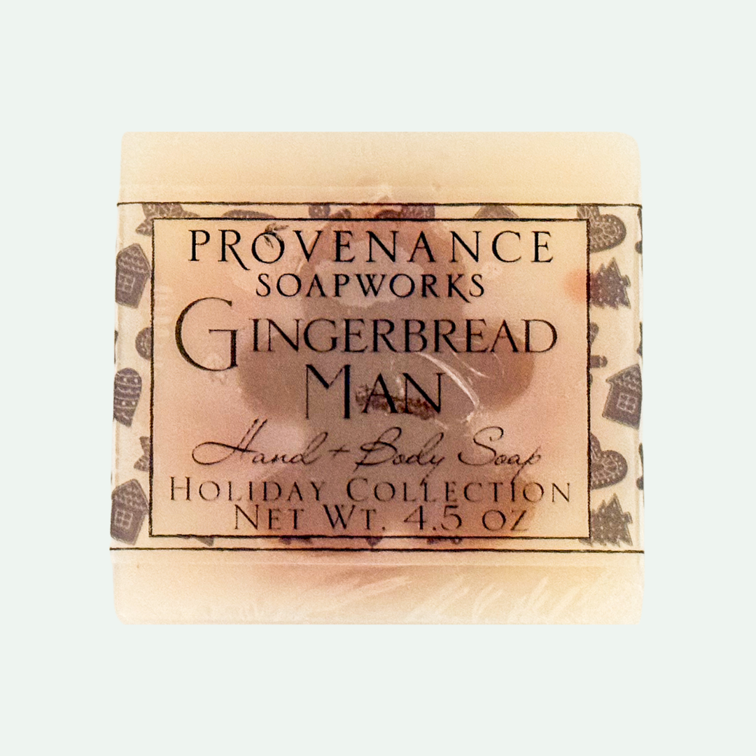 Spicy and nutty, with a dash of applejack and gingersnap, our gingerbread guy is the cutest around! You'll feel festive in no time if you've got a bar of this in the shower!